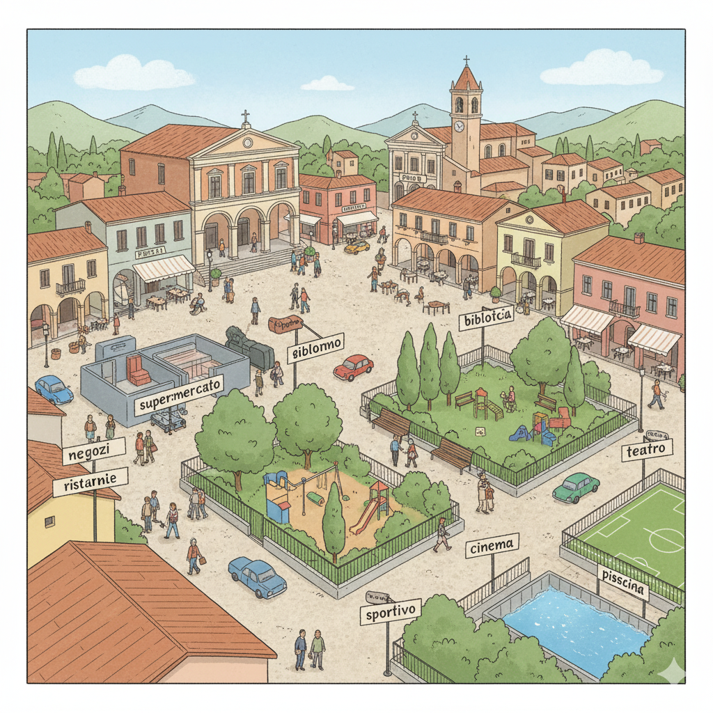 Marco, per andare a scuola, passa davanti al supermercato e alla biblioteca. Il paese ha anche un cinema e un teatro per gli spettacoli. Per gli amanti dello sport, c'è un centro sportivo con un campo di calcio e una piscina.