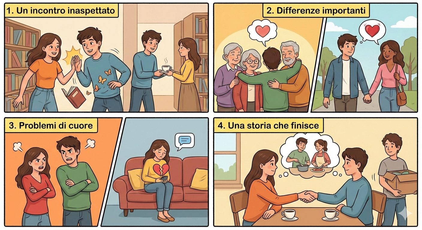 "Marco non credeva nel colpo di fulmine, finché non ha incontrato Giulia in biblioteca. È stato un momento magico: lui ha sentito subito le farfalle nello stomaco. Per settimane le ha fatto il filo portandole il caffè ogni mattina. Finalmente, ieri ha trovato il coraggio di chiederle di uscire e lei ha detto di sì! Ora Marco è al settimo cielo."