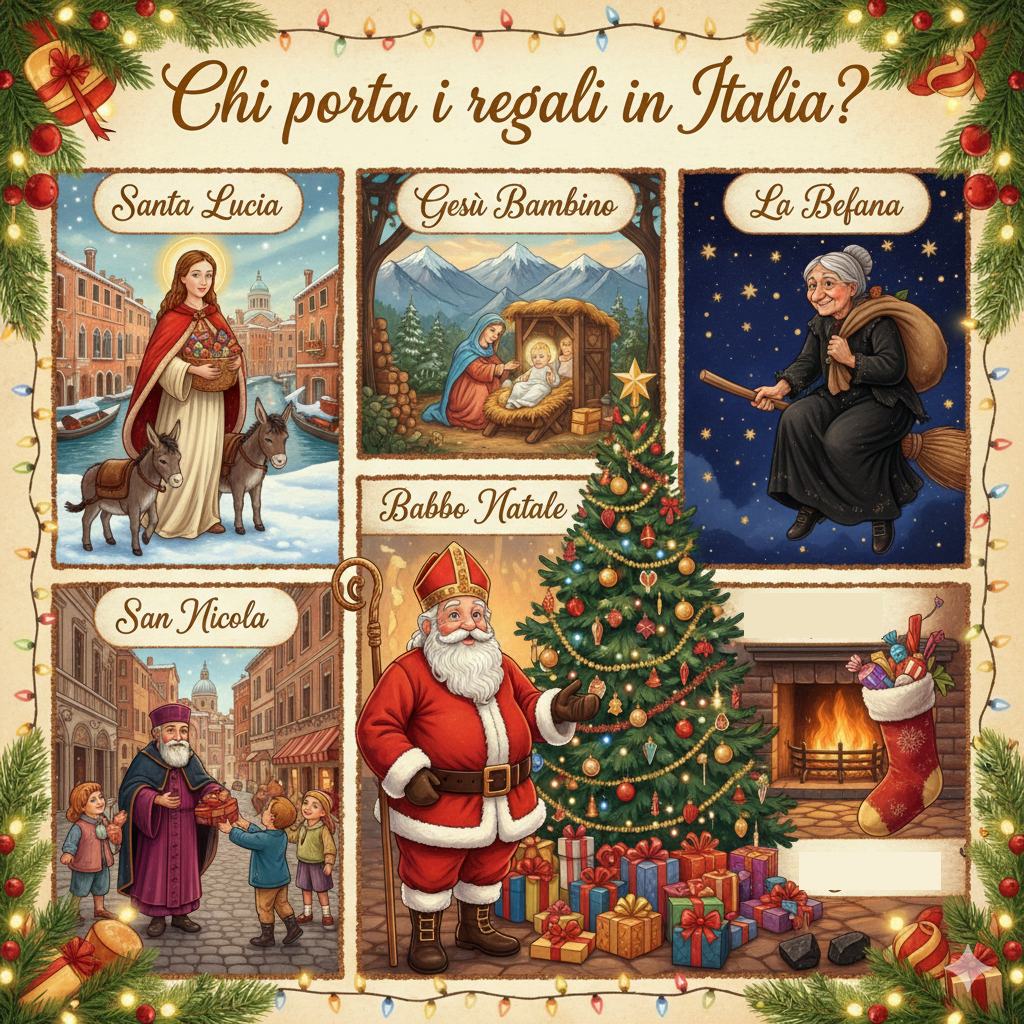 In Italia, ci sono diverse tradizioni per i regali. A Natale, i bambini ricevono i regali da Babbo Natale, che arriva nella notte tra il 24 e il 25 dicembre. In alcune regioni, come il Trentino o alcune zone del Sud, i doni possono arrivare anche da Gesù Bambino. In altre parti del Nord Italia, come il Veneto o la Lombardia, i bambini aspettano Santa Lucia, che porta i regali il 13 dicembre. In alcune città si festeggia anche San Nicola il 6 dicembre. Infine, il 6 gennaio arriva la Befana, una vecchietta simpatica che porta dolci ai bambini buoni e carbone dolce ai bambini un po’ monelli. Per questo, in Italia i regali possono arrivare in giorni diversi, secondo la tradizione della regione.