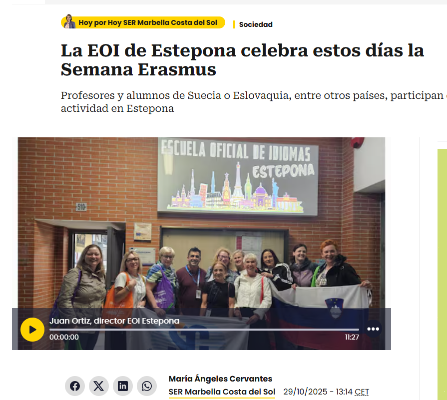 La periodista María Ángeles Cervantes ha charlado con nuestro director sobre dos grandes acontecimientos que nos llenan de orgullo: la celebración de nuestra Erasmus+ Week en la EOI Estepona 🌍💫 y nuestra participación en el XIII Congreso Nacional de Escuelas Oficiales de Idiomas, celebrado en Murcia 🇪🇸📚.