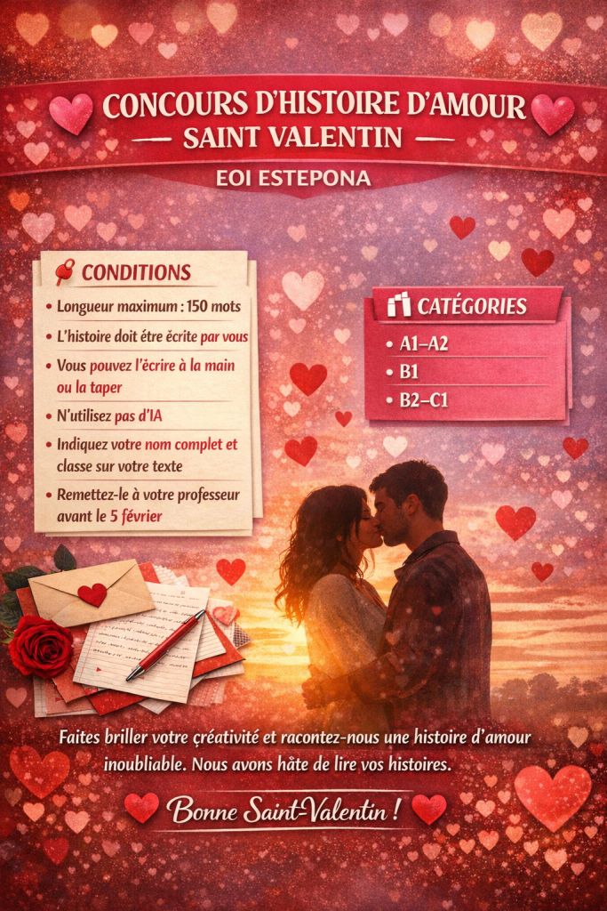 Con motivo de la celebración de San Valentín, la EOI Estepona organiza un Concurso de Historias de Amor dirigido al alumnado de todos los niveles. Una oportunidad perfecta para quienes disfrutan escribiendo y quieren dar rienda suelta a su creatividad.